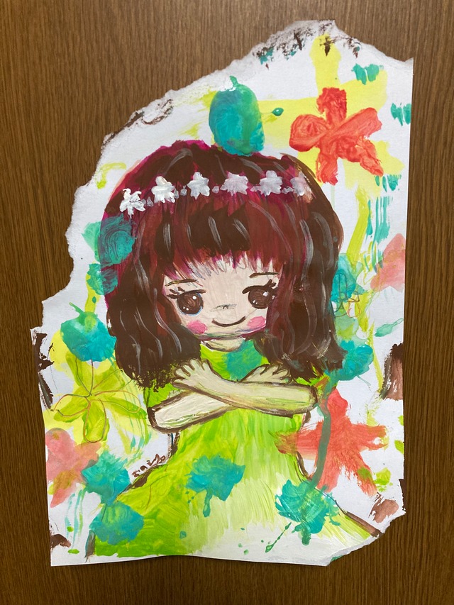 紙・アクリル絵の具・色鉛筆 A4の額に入れていただき、下にマットを引いていただきちょうどよい大きさです。 ※製作上、紙を手で破いて制作しているため、慎重に扱ってください。 元々破れているような加工です。